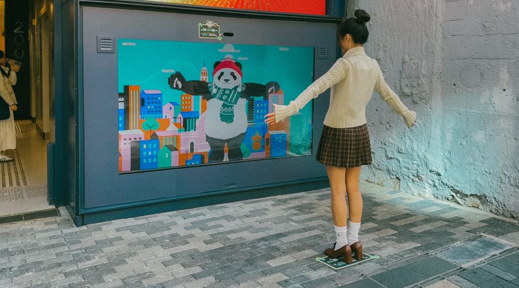 The installation centers on a 150-inch high-resolution LED screen, paired with advanced body detection sensors (utilizing infrared or radar technology to precisely capture human contours and movements). Visitors simply step onto the designated interactive stickers on the floor, triggering the program instantly. The system detects the user’s body position and posture, generating real-time responsive visual effects. A cute panda cartoon character appears on the screen, fully mimicking the user’s body movements in real time—for example, raising hands, jumping, turning, or posing in various ways, the panda synchronizes perfectly, allowing visitors to experience highly realistic body tracking technology firsthand. This contactless, real-time interaction design not only delivers immense fun and surprise but also lets visitors personally feel the advanced body detection capabilities, while the adorable panda character adds warmth and joy, effectively communicating the property’s modern, lifestyle-oriented, and innovative selling points, such as spacious layouts, natural lighting, and convenient living, deepening emotional connections and impressions with potential tenants or buyers.